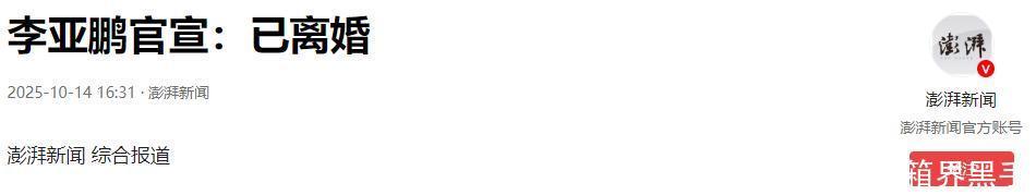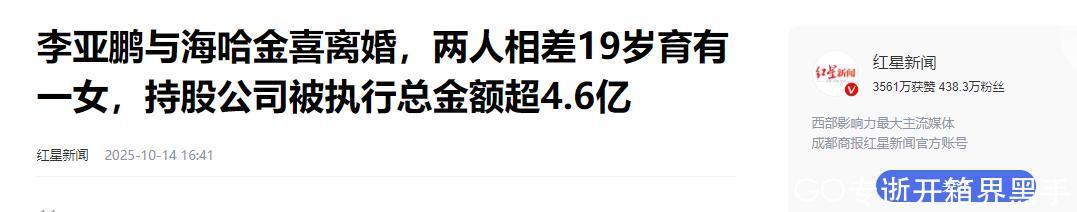 2025 年 10 月 14 日,54 岁的李亚鹏与小 19 岁的妻子海哈金喜通过社交平台官宣离婚。