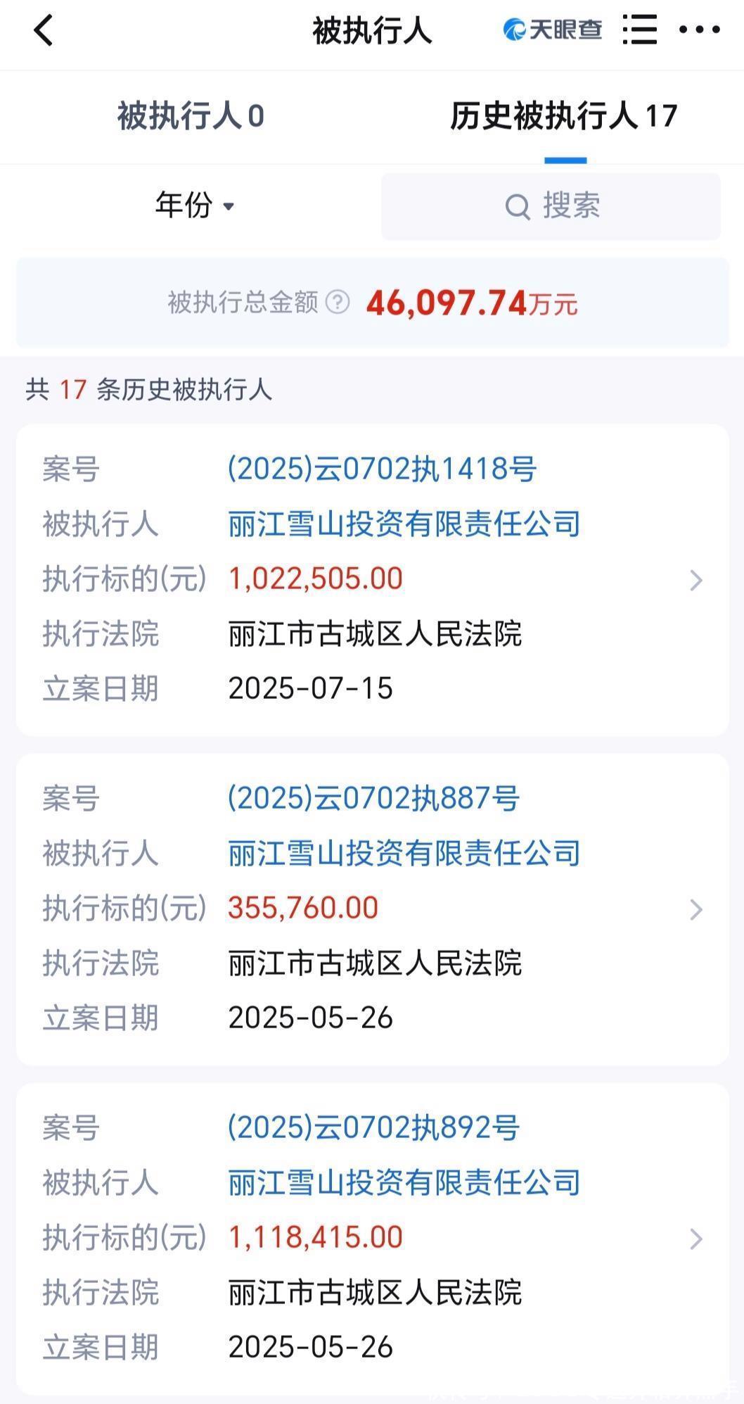 可债务不会因为解释就消失,丽江雪山投资公司不仅欠着 4.6 亿执行款,2025 年 4 月还被查出欠税 561 万,7 月又被下达限制消费令,紧接着新增 102.25 万执行标的,债务雪球越滚越大。